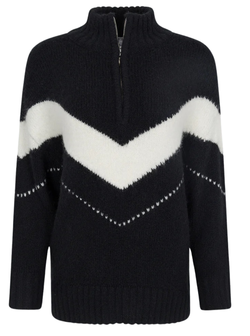 A modern knit with graphic appeal, Arden features a relaxed silhouette and half-zip neckline. The bold chevron colorblock pattern in Black Vanilla Ice delivers contrast and dimension while keeping the look timeless and versatile.