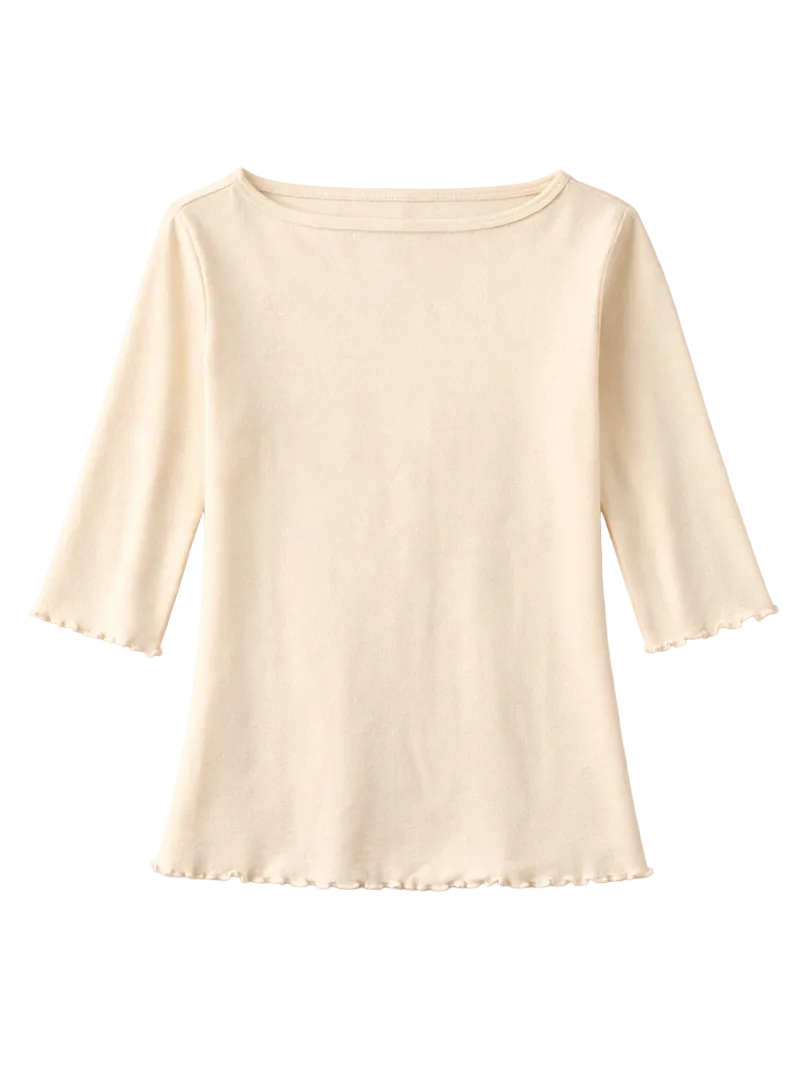 Our most delicate semi-opaque pointelle knit inspired by vintage undergarments. This quarter sleeve top is accented by a delicate merrow edge and a feminine boatneck.