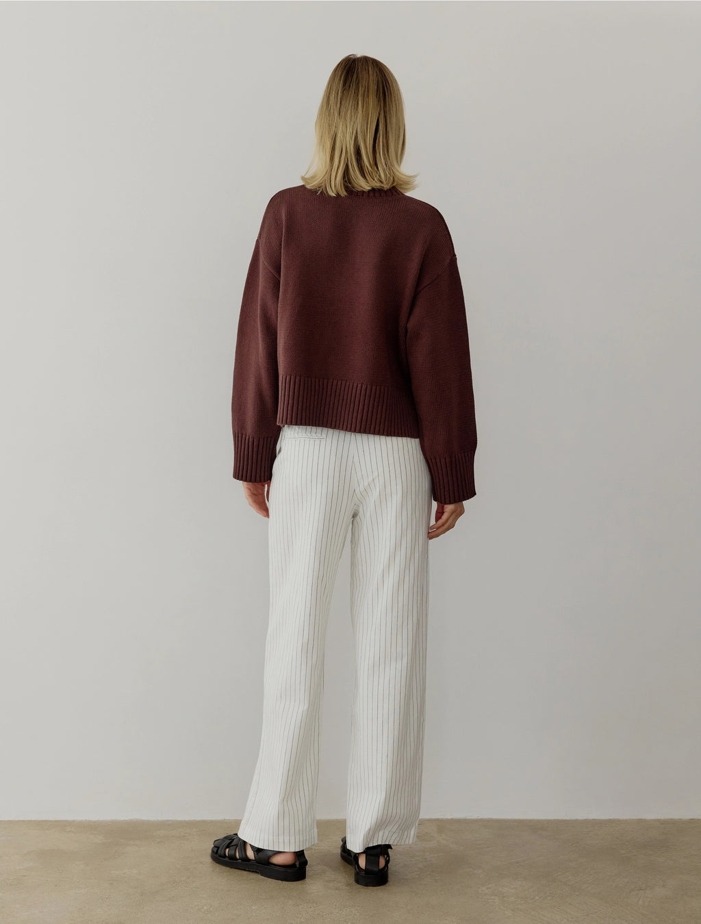 CREW NECK SWEATER WITH BANDED BOTTOM AND LOND SLEEVES. SLITS ON EACH SIDE OF BOTTOM BAND.