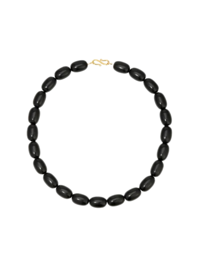 The Clementine Necklace — a strand of smooth resin beads finished with a sculptural gold-plated S-lock, the piece embodies effortless elegance with a contemporary edge.