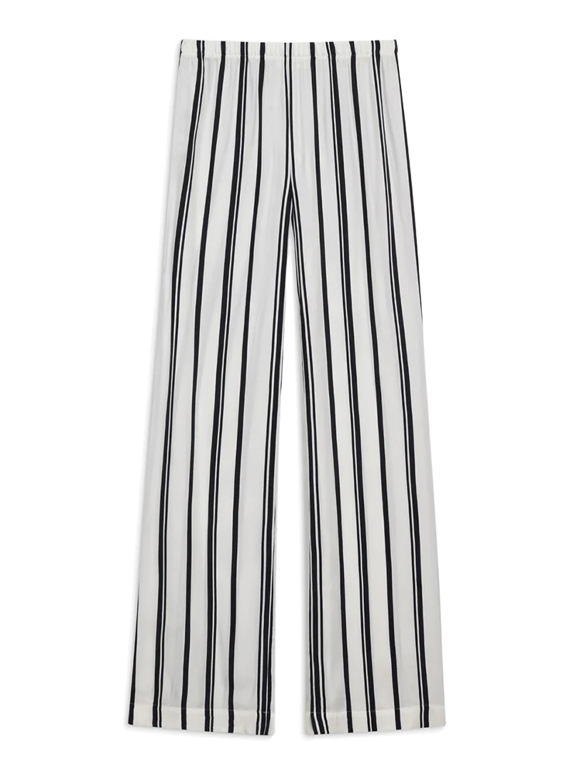 The Elain Pant is an effortless and flowy separate made from a lightweight cupro blend in ivory and black stripe.- Cupro blend- Unlined- Relaxed fit- Mid rise- Pull-on construction- Thick waistband- Slim wide leg- Full-length inseam