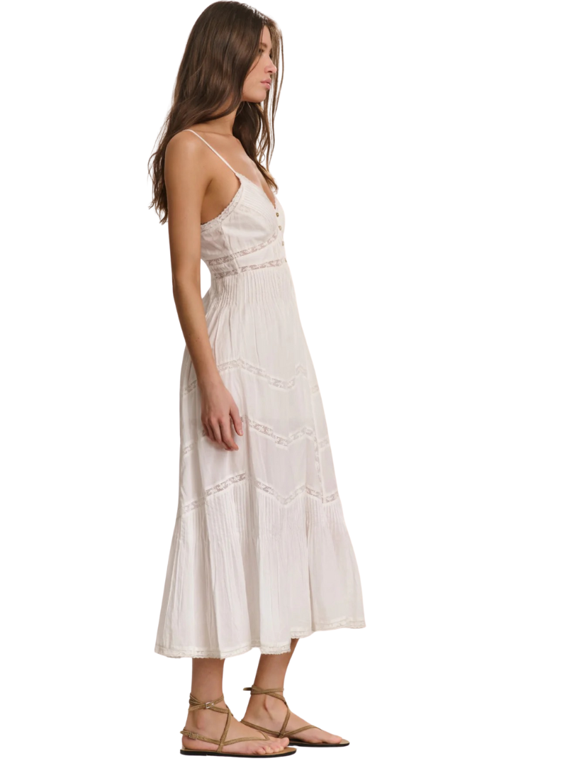 Timeless and effortlessly chic, the Esilda Dress is an airy cotton midi beginning with spaghetti straps above a v-neckline that sits above a fitted waist yoke that descends to a center front placket with buttons. This piece has a smocked back for easy and comfortable wear.