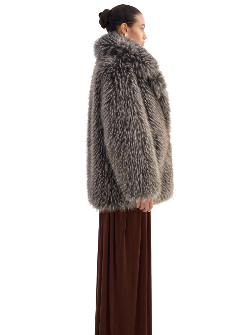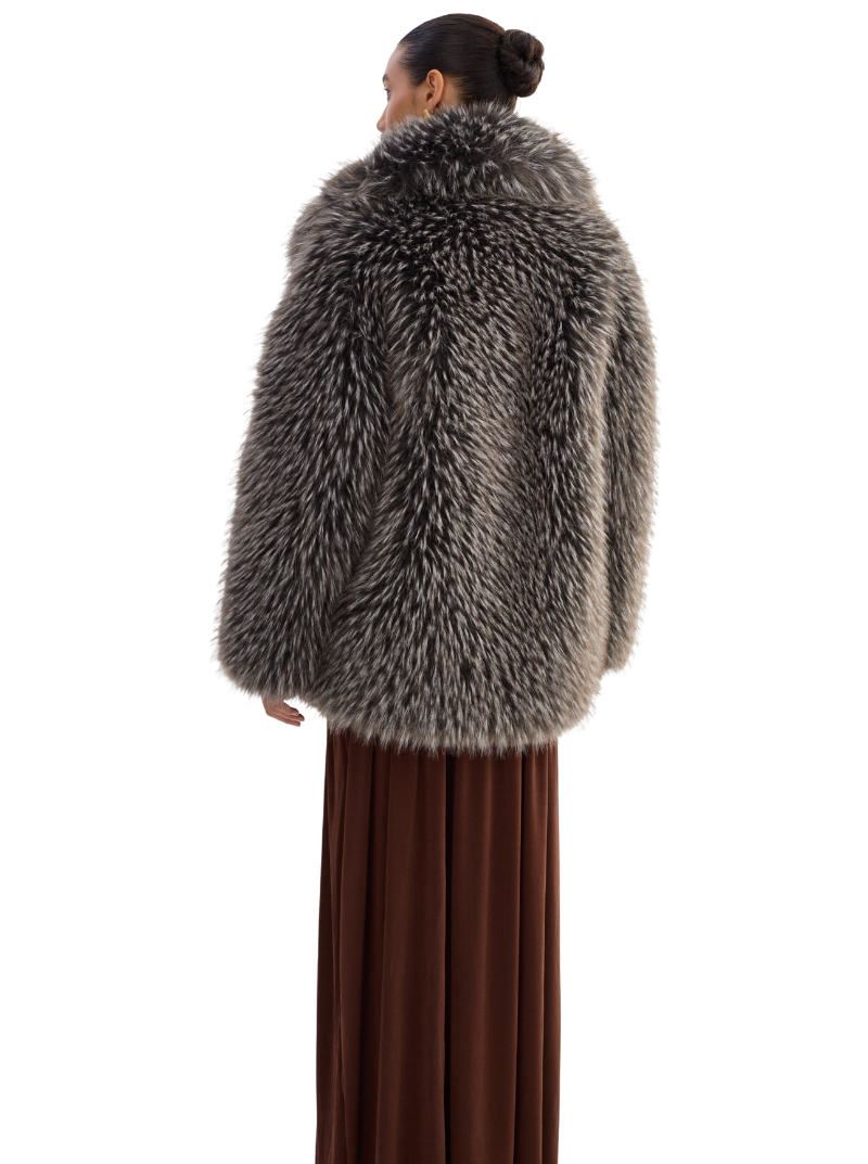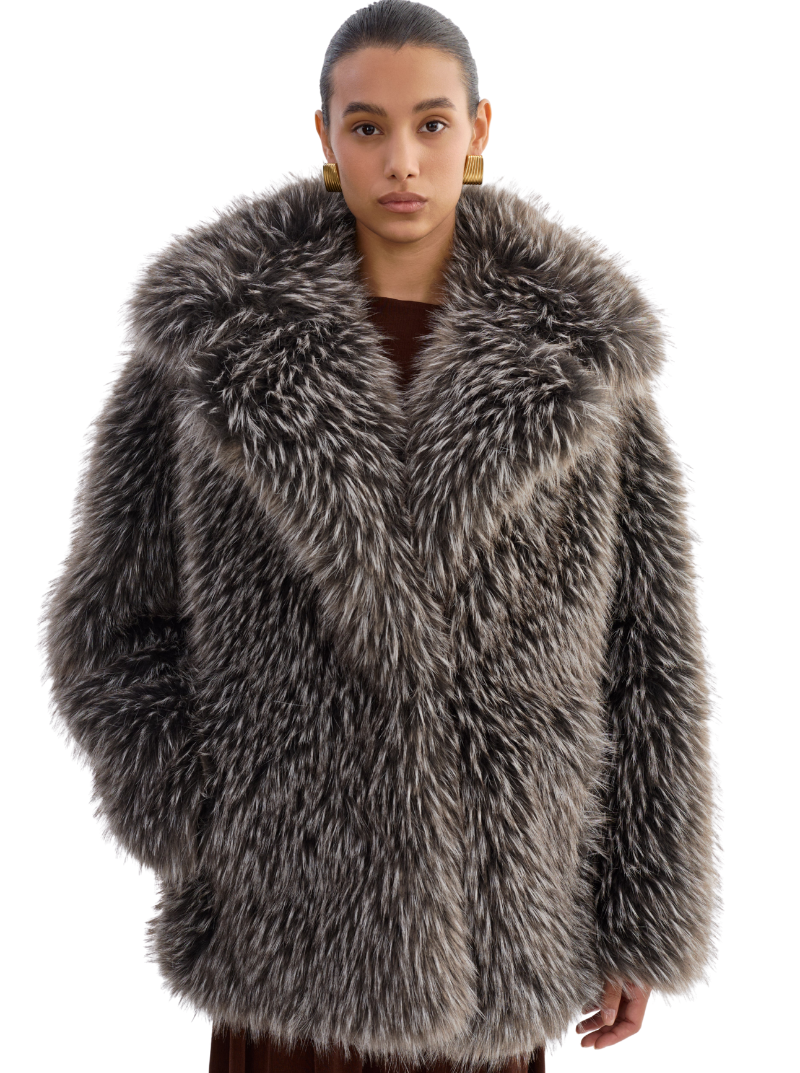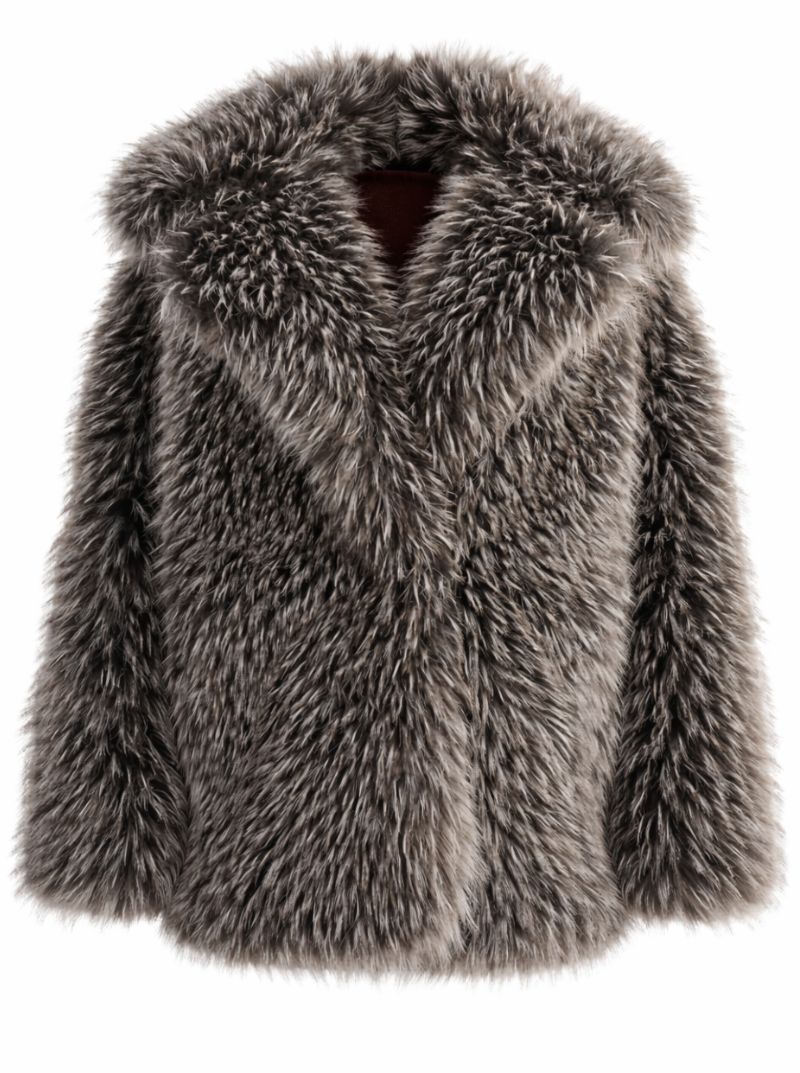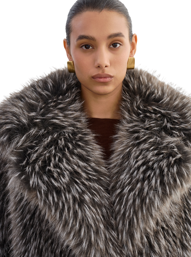 The FINAYA Faux Fur Coat channels bold glamour with its voluminous long-hair texture and oversized notch collar. Designed in a relaxed silhouette with hook closures at the front, it offers both statement appeal and effortless warmth. A true standout for evening outings or city layering.