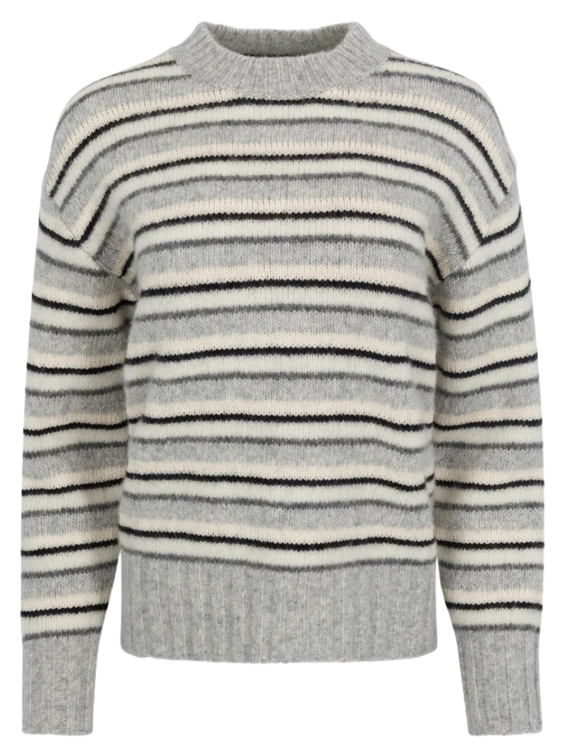 A modern essential, Hanna features an oversized fit that drapes effortlessly while maintaining its shape for a balance of comfort and structure. Knit from a wool-cotton blend, it’s soft yet substantial—perfect for layering or wearing solo. Variegated stripes in Grey White bring subtle texture and a graphic, contemporary finish.