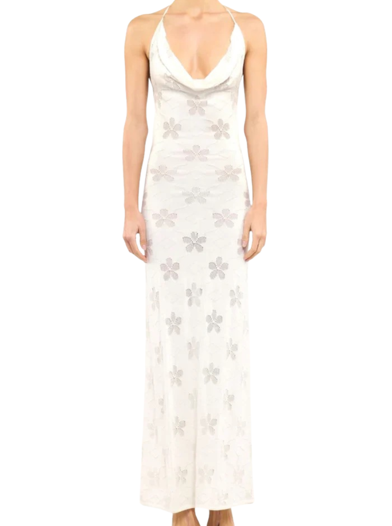 A backless floor-length silhouette with narrow back ties for elevated simplicity. Featuring a re-invented design to our signature flower pointelle motif.