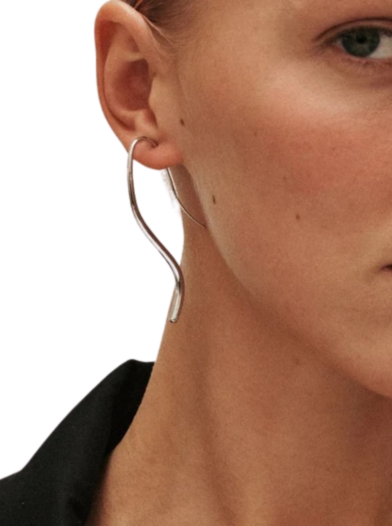 Introducing the Lenora Earrings. The earrings feature a sleek, fluid silhouette that slips effortlessly through the ear — no backing required. Crafted with a refined minimalism, their gentle curve catches the light with quiet sophistication.