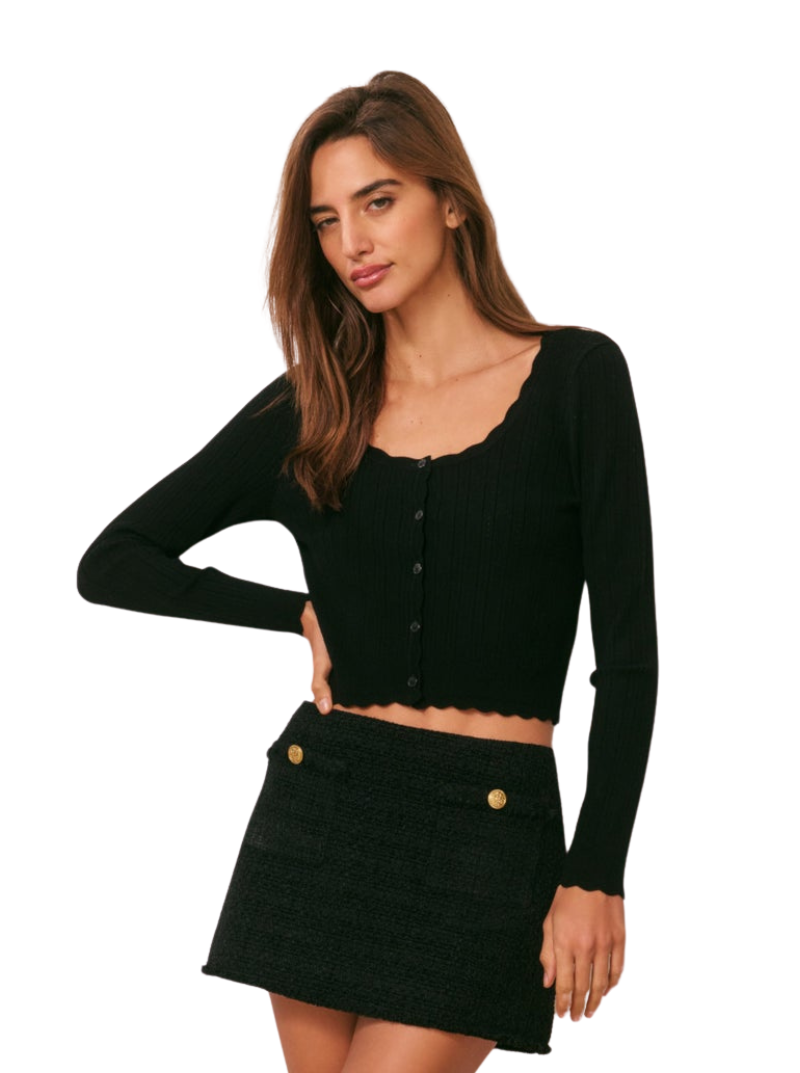 Introducing the Martti Cardigan. This elevated knit arrives in our best-selling extra soft yarn with a comfortable stretch fit and rib pointelle stitch all over. The cardigan begins with a scoop neckline, slim fit sleeves, a placket at the neckline and at the edges, and is finished with our custom LoveShackFancy shell buttons down center front.